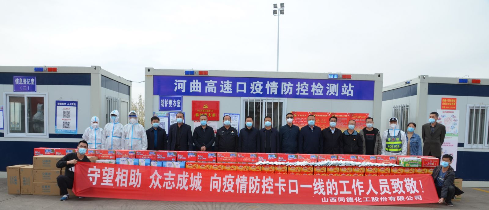 4月13日上(shang)午,山西(xi)同德化工股(gu)份有限公司河曲點管(guan)理人員帶著(zhu)防疫口罩1800只、罐 頭100件(jian)、酸奶100提、方便面100件(jian)等物資,到河曲高速(su)疫情防(fang)控(kong)檢查卡口(kou),慰問(wen)奮戰在 疫(yi)情防控(kong)卡口一(yi)線的工作(zuo)人員(yuan),對(dui)河曲(qu)縣疫(yi)情防控(kong)卡口一(yi)線工作(zuo)人員(yuan)舍小家保大家,堅盾 護民的高尚精神,吃(chi)苦(ku)奉獻(xian)、連續作戰的良好風貌,表達了由衷的關心與(yu)感謝;并表示同 德化工(gong)(gong)作(zuo)為本(ben)土上市公(gong)司應伸(shen)出援助之手,擔負應盡的(de)社(she)會(hui)責任,為河曲疫情防控工(gong)(gong)作(zuo)做 力所能(neng)及(ji)的貢獻(xian)。河曲(qu)縣公(gong)安局政委王大偉、副局長(chang)賈敏、王梁(liang)、黨委委員、民爆大隊長(chang) 陳(chen)志平(ping)、衛健局主任王建軍出席慰問捐贈儀(yi)式。 |